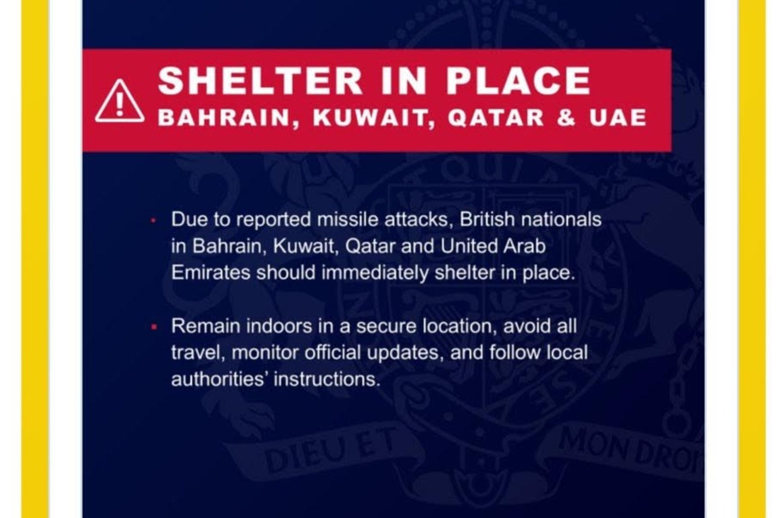 The updated advice on the FCDO website also warned British nationals in Bahrain, the United Arab Emirates, Qatar and Kuwait to immediately find shelter in place.